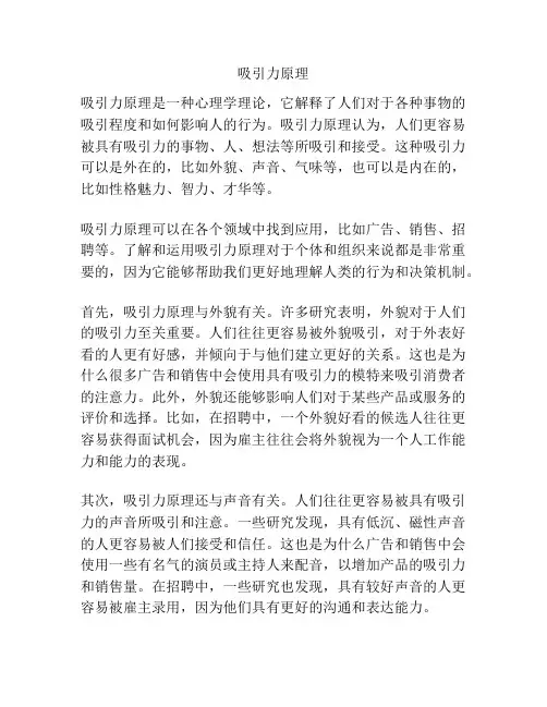 吸引力原理吸引力原理是一种心理学理论,它解释了人们对于各种事物的吸引程度和如何影响人的行为。