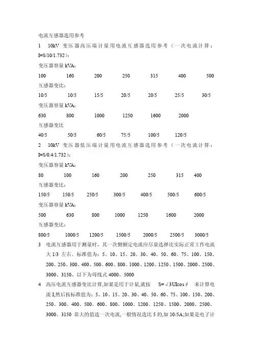 电流互感器选用参考1 10kV变压器高压端计量用电流互感器选用参考(一次电流计算:I=S/10/1.732):变压器容量kV A:100 160 200 250 315 400 500 互感器变比:10/5 10/5 15/5 20/5 20/5 25/5 30/5变压器容量kV A:630 800 1000 1250 1600 2000互感器变比40/5 50/5 60/5 75/5 100/5 120/52 10kV变压器低压端计量用电流互感器选用参考(一次电流计算:I=S/0.4/1.732):变压器容量kV A:80 100 160 200 250 315 400互感器变比:150/5 150/5 250/5 300/5 400/5 500/5 600/5变压器容量kV A:500 630 800 1000 1250 1600 2000互感器变比:800/5 1000/5 1200/5 1500/5 2000/5 2500/5 3000/53电流互感器用于测量时,其一次侧额定电流应尽量选择比实际正常工作电流大1/3 左右。