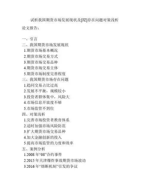 下⽂是店铺为⼤家搜集整理的关于期货市场论⽂的内容,欢迎⼤家阅读参考! 期货市场论⽂篇1 浅析我国期货市场问题 [摘要]⽂章指出了我国期货市场上存在的主要问题,分析了存在问题的原因,在此基础上提出了适合我国期货市场发展的策略。