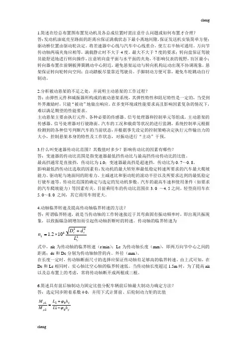 1.简述在绘总布置图布置发动机及各总成位置时需注意什么问题或如何布置才合理?答:发动机油底壳至路面的距离应保证满载状态下最小离地间隙。
