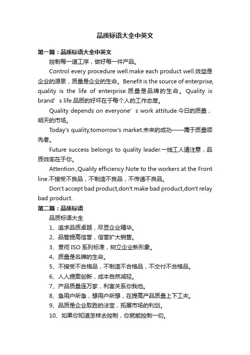 品质标语大全中英文第一篇:品质标语大全中英文控制每一道工序,做好每一件产品。