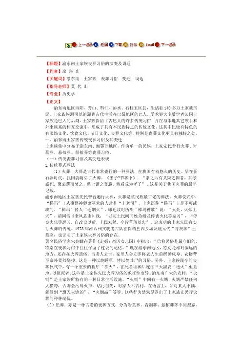 一、土家族丧葬仪式概述土家族是一个重视宗族和家族的大家庭型社会,丧葬仪式在土家族文化中具有重要地位。