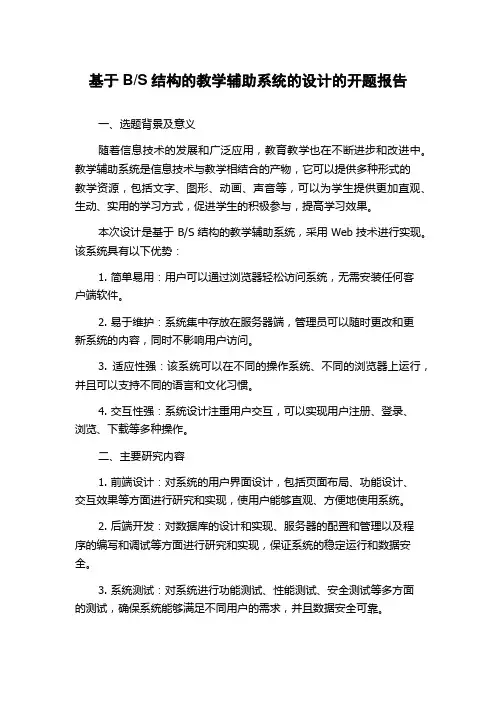 基于B/S结构的教学辅助系统的设计的开题报告一、选题背景及意义随着信息技术的发展和广泛应用,教育教学也在不断进步和改进中。
