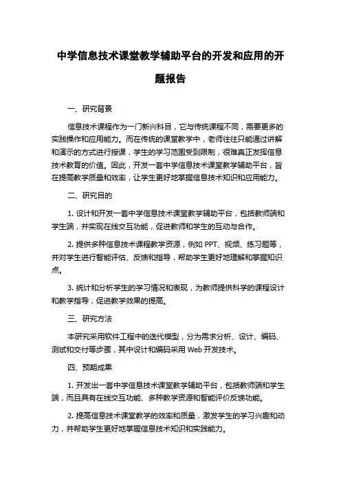 三、研究内容和方法本研究将包括以下内容:(1)需求分析:分析教师和学生在教学过程中的需求,明确平台的功能和特点,确保平台的开发和功能的完善。