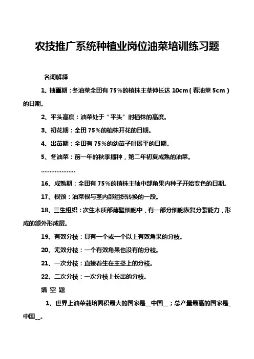 油菜栽培练习题一、名词解释1.油菜根颈2.油菜有效分枝3.双低油菜4.油菜“早花早蓦”5.冬发油菜6.冬性型油菜7.春油菜8.秋发型栽培9.高脚苗10.油菜现蕾11.开盘期12.冬壮型油菜13.油菜盛花期14.油菜抽蓦15.油菜初花期16.油菜终花期17.冬油菜二、判断题1.油菜“花而不实”现象是由缺硼引起的一种生理性病害。