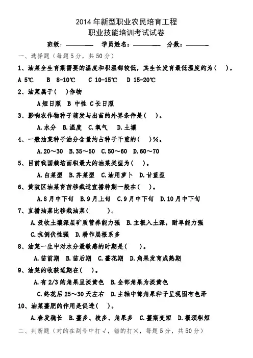 泾县2019年新型职业农民(专业技能型)农业生产种植业技术培训理论考试试卷姓名:得分:一、填空题(每题5分,共30分)1、按油菜的形态发生及生理特征,可把油菜的全生育期分为苗期、蕾苔期、开花期和成熟期四个生育时期。