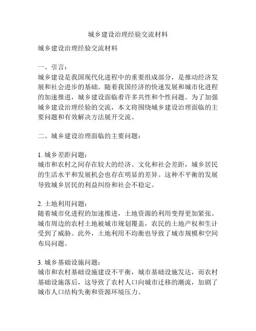 城乡建设治理经验交流材料城乡建设治理经验交流材料一、城乡一体化发展的背景和意义随着中国城市化进程的不断推进,城乡差距日益凸显,城乡发展不平衡不充分的问题日益突出。