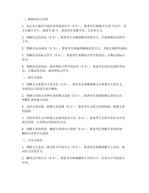 一、基础知识与应用1. 识记并正确书写现代常用规范汉字(5分):要求考生准确书写25个汉字,其中生僻字5个,易错字10个,要求考生掌握字形、字音和字义。