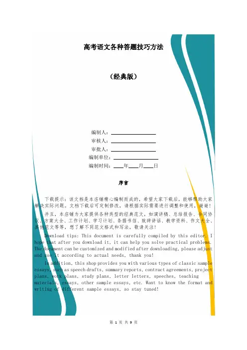 高考语文各种答题技巧方法(经典版)编制人:__________________审核人:__________________审批人:__________________编制单位:__________________编制时间:____年____月____日序言下载提示:该文档是本店铺精心编制而成的,希望大家下载后,能够帮助大家解决实际问题。