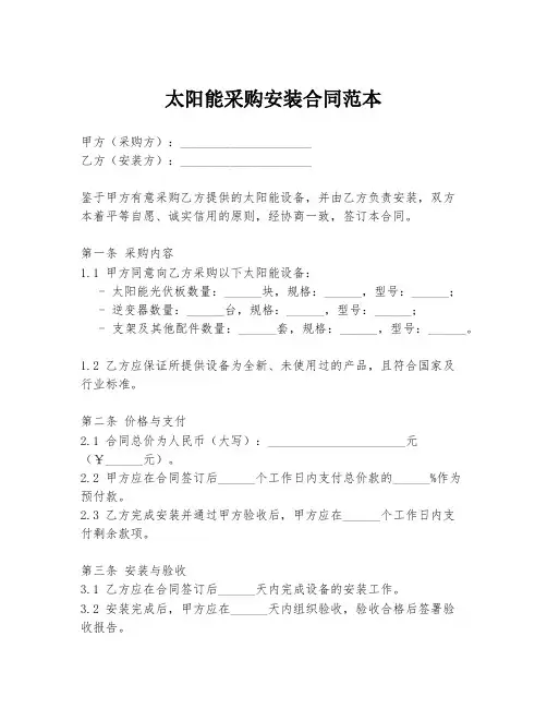 太阳能采购及安装合同范本合同编号:____________甲方(采购方):____________乙方(供应方):____________根据《中华人民共和国合同法》及相关法律法规的规定,甲乙双方在平等、自愿、公平、诚实信用的原则基础上,就太阳能采购及安装事项达成一致,签订本合同。