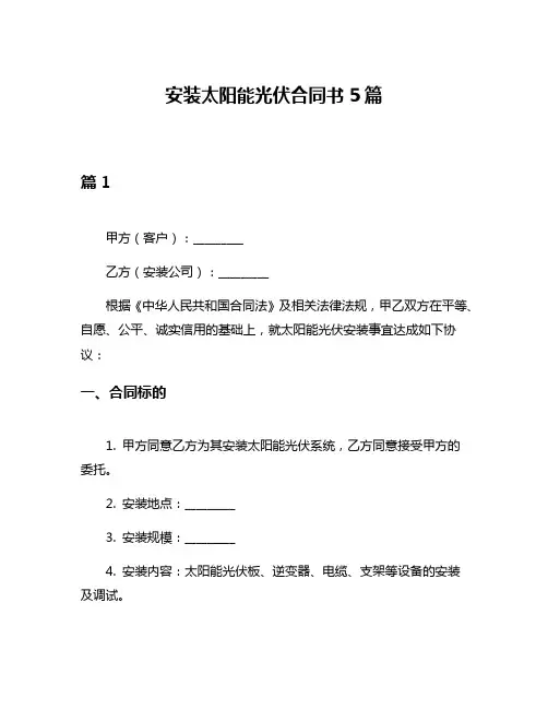 太阳能工程安装合同范文5篇篇1太阳能工程安装合同范文甲方:_______________(委托人)乙方:_______________(承包商)鉴于甲方拟对其位于_______________(地址)的房屋/厂房进行太阳能光伏发电系统的安装,并为此选择乙方作为合作承包商,甲乙双方本着平等、自愿、公平的原则,经友好协商,就相关事宜达成如下一致意见并签订本合同:一、安装范围及内容:1. 乙方将在_______________(具体位置)安装太阳能光伏发电系统,包括太阳能发电板、电池储能系统、逆变器及其它相关设备,保证系统能够正常运行。
