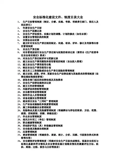 安全标准化建设文件、制度目录大全1、生产目标管理制度(制定、分解、实施、考核,明确责任部门、现任人及相应责任)2、年度安全生产目标3、安全生产监测记录4、安全生产评估报告,实施计划的调整,计划的修改(如有必要)5、设置安全管理机构的制度6、安委会会议纪要7、建立针对安全生产责任制的制定、沟通、培训、评审、修订及考核等内容的管理制度8、安全生产责任制9、对各管理层进行安全生产责任制与权限的培训记录(要符合《生产经营单位安全培训规定》要求)10、对安全生产责任制评审与更新记录11、建立安全生产费用提取和使用管理的制度(安全投入管理)12、建立安全生产费用使用台账13、制定安全生产费用使用计划14、建立员工工伤保险或安全生产责任保险的管理制度15、建立识别、获取、评审、更新安全生产法律法规与其他要求的管理制度(法律法规标准规范管理)16、获取各部门适应的法律法规及其他要求17、安全生产法律法规培训记录18、建立文件的管理制度19、风险评估和控制管理制度20、安全教育培训管理制度21、特种作业人员管理制度22、设备设施安全管理制度23、建设项目安全“三同时”管理制度24、生产设备设施验收和报废管理制度25、施工和栓维修安全管理制度26、危险物品及重大危险源管理制度(明确辨识与评估的职责、方法、范围、流程、控制原则、回顾、持续改进)27、作业安全管理制度28、相关方外用工(单位)管理制度29、职业健康管理制度30、劳动防护用品(具)和保健品管理制度31、安全检查及隐患治理制度32、应急管理制度33、事故管理制度(明确报告、调查、统计、分析、回顾、书面报告样式和表格等内容)34、安全绩效评定管理制度(明确对安全生产目标完成情况、现场安全状况与标准化条款和符合情况及安全管理实施计划落实情况的测量评估方法、组织、周期、过程、报告与分析等要求)35、对安全生产规章制度学习培训的记录36、岗位安全操作规程37、对岗位操作规程学习的培训记录(含“三级”、“五新”、转岗、离岗)38、对安全生产法律法规、标准规范、规章制度、操作规程执行情况的评估报告39、对前款评估报告进行修订的计划和记录资料40、安全生产文件41、事故与事件记录42、风险评价信息43、标准化系统评价报告44、事故调查与报告45、检查与整改记录46、职业卫生检查与监护记录47、安全活动记录48、法定检测记录49、关键设备设施档案50、应急演习信息51、承包商与供应商信息52、维护与校验记录53、技术图纸54、特种作业操作资格证55、安全预评价报告、安全专篇、安全验收评价报告56、设备、设施运行台账57、工业气瓶的入库和发放实行登记制度58、锅炉安全操作规程59、临时电气线路审批制度和手续(明确架设地点、用电容量、用电负责人、审批部门意见、准用日期)60、建立进入收尘器的安全操作规程61、起重机械检验报告62、特种设备管理制度(锅炉、压力容器、起重设备、安全附件及安全保护装置等)63、建立下列危险作业管理制度(明确责任部门、人员、许可范围、审批程序、许可签发人):1):危险区域动火作业;2):进入受限空间作业;3):高处作业;4):大型吊装作业;5):预热器清堵作业;6):篦冷机清大块作业;7):水泥生产筒型库清库作业;8):交叉作业;9):高温作业;10):其他危险作业。