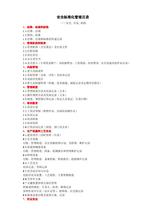安全标准化管理目录——安全, 目录, 机构1.法律、法规和标准1-1法律、法规1-2规范、标准1-3法律、法规和标准的传递记录2.管理机构和职责2-1管理机构(含安委会)及任命文件2-2任职资格2-3岗位责任2-4安全责任书2-4安全投入(专项资金账户、风险抵押金、工伤保险、培训费用、安全设施及防护品目录)3.风险管理3-1重大风险清单3-2风险管理(分析、评价)及培训记录3-3风险评价报告3-4重大危险源管理(档案、技术措施、演练记录及定期评估报告)4.管理制度4-1管理制度目录及发放记录(文本)4-2操作规程目录及发放记录(文本)4-3制度、规程修订和记录(参会人员签证、生效日期)5.培训教育5-1培训计划5-2上岗证明细(特种作业、内部培训操作证)5-3培训记录5-4培训档案5-5培训资料5-6日常活动记录(班组、部门及企业)6.生产设施和工艺安全6-1建设项目三同时资料(目录)6-2安全设施台账、管理制度、安全设施检修计划、及检修、维护记录6-3监视和测量设备台账、管理制度、档案、检测报告和管理维护记录6-4特种设备台账、管理制度、备案档案、检验报告、校验维护记录6-4工艺安全培训记录、考核记录6-5化学品告知与应急危险信息及处置、工艺流程、主要参数限值6-6开停车方案6-7关键装置和重点部位管理档案或明细表、专责人、检查、维修记录各种作业许可证(动火证等),检修前、后交接记录6-8报废设备台账及处理方案、记录7.作业安全7-1安全设施、消防器材、防护设施台账7-2作业许可及作业时的警示标志7-3承办商管理8.职业健康8-1职业危害清单和防治计划8-2职业健康监护档案8-3体检台账8-4作业人员防护标准及配发台账、检查记录8-5作业场所报警、冲洗、防护急救设施清单9.危险化学品管理9-1化学品(原料、中间品及产品)档案9-2安全技术说明书及标签9-3化学品等级情况9-4危险告知和应急处理9-5储存、运输安全10.事故与应急10-1应急机构及队伍建设10-2机构职责10-3应急配备器材、通信设施清单及维护记录10-4演练记录10-5事故报告程序10-6预案及修订记录11.检查与自评12.其他要求12-1当地政府相关文件和要求12.2当地安监相关文件和要求。