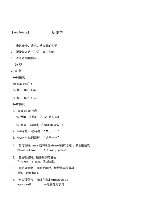 祈使句I.Grammar1.定义:表示说话人对对方的叮嘱、劝告、请求或命令II.Exercise1.and wash your hands.A、GoB、To goC、GoingD、Went2.kind to our brothers and sisters.A、BeingB、To beC、BeenD、Be3.Let's to school.A、to goB、goC、goingD、Went4.Please me look after my baby when I'm out.A、to helpB、helpC、helpingD、helped5.Let me it by myself.A、doingB、to doC、doD、did6.the book here.A、Not putB、Don't putC、Never to putD、Don't putting7.It's raining now. until after the rain.A、Don't let's go out B 、Never let's go outC、Let's not go out D 、Not let's go out8.Not let's go out 8.Sit down, please, ?A、shall weB、will youC、don't youD、shall I答案与解析:祈使句1.考查祈使句。