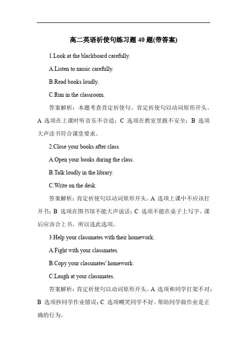 高二英语祈使句练习题40题(带答案)1.Look at the blackboard carefully.A.Listen to music carefully.B.Read books loudly.C.Run in the classroom.答案解析:本题考查肯定祈使句。