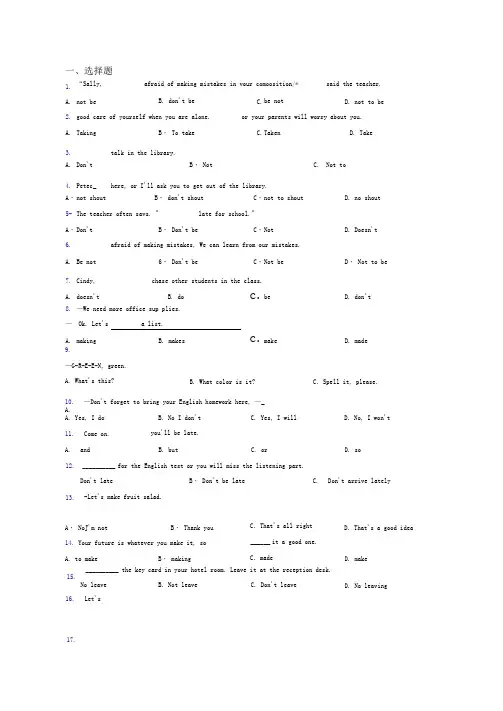 15.17.一、选择题1. “Sally, afraid of making mistakes in vour comoosition/*said the teacher.A. not beB. don't beC.b e not D. not to be2. good care of yourself when you are alone. or your parents will worry about you.A. TakingB ・ To takeC.T aken D. Take3.talk in the library.A. Don't B ・ NotC. Not to4. Petec_ here, or I'll ask you to get out of the library.A ・ not shoutB ・ don't shoutC ・ n ot to shoutD. no shout5- The teacher often savs. " late for school."A ・ Don'tB ・ Don't beC ・ N otD. Doesn't6.afraid of making mistakes, We can learn from our mistakes.A. Be not 6・ Don't beC ・ N ot beD ・ Not to be7. Cindy, chase other students in the class.A. doesn'tB. doc. b eD. don't8. —We need more office sup plies.— Ok. Let's a list.A. makingB. makesc. m akeD. made9.—G-R-E-E-N, green. A. What's this?__________ the key card in your hotel room. Leave it at the reception desk.No leave B. Not leave C. Don't leave16. Let's10. —Don't forget to bring your English homework here, —_ A. Yes, I do B. No I don't C. Yes, I will 11. D. No, I won'tA. Come on. andyou'll be late. B. butC. orD. so12. __________ for the English test or you will miss the listening part.Don't lateB ・ Don't be lateC. Don't arrive lately13. -Let's make fruit salad.B ・ Thank you14. Your future is whatever you make it, so A. to make B ・ makingA ・ NoJ'm not C. That's all right ______ it a good one. C. madeD. That's a good ideaD. makeB. What color is it?C. Spell it, please.A.D. No leaving15.17.playing, is…Mike, _________一 Sorry, Ms. Clark.A. ■ volleyball. That _____________ g ood.B. playing, soundsC. play, sounds _ run in the hallways.D. pla% is soundthe living room blue, Andrew.—OK, mum. What about orange? A. Doesn't paint B ・ Didn't paint C. Not paintD. Don't paint19.Dave, _late for class again and you must follow the school rules.A. does n't arrive B ・ arrivesC. don't arrive20.o music to make you feel happy when you are sad.A. To listenB. ListensC. Listeningany more. It's no use, We will not buy you any chocolate.A. You don't cryB. If you cryC. Don't cryD. Stop crying22. Tom, ______please. I am afraid it will take you one more hour _________ your homework.A. be quick; finishB. is quick; finishingC. be quick; to finishD. be quickly; to finish23._____ away from the rivecyoung kids.lVs too dangerous.A. StaysB. StayingC. To stayD. Stay24・—Could you take me to the cinema? I want to see the movie named Pacific Rim (《环太平 洋》)• —— _______ your homework first, and then well talk about it. A- Finish B. Finished1. B解析:B 【解析】 【详解】 句意:老师说: 本题考査的是祈使句的否宦形式,祈使句的构成为dorVt+动词原形,又因为afraid 害怕 的,是形容词,所以前而要跟bi 故答案选B 。