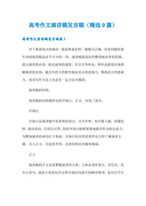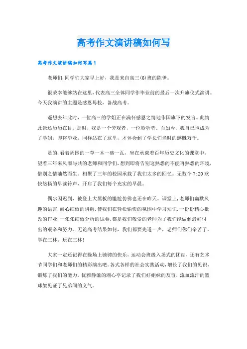 高考作文演讲稿咋写(20篇通用)高考作文演讲稿咋写篇1尊敬的老师,亲爱的同学们:大家好!隆冬已至,寒风刺骨,它可以侵袭我们的身体,却无法冻结往高考的步伐。