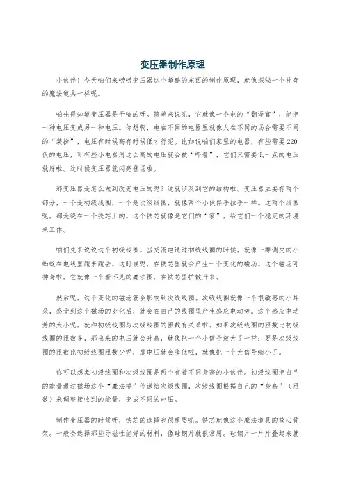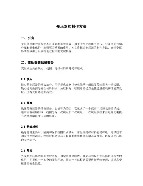 变压器的制作方法一、引言变压器是电力系统中不可或缺的重要装置,用于改变交流电的电压。