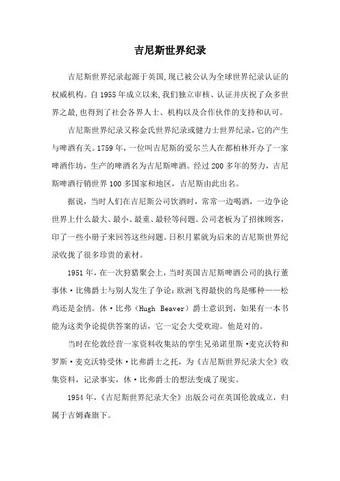 三、吉尼斯纪录的诞生吉尼斯纪录的起源可以追溯到1951年,当时一个名叫伊丽莎白·伯尔(Elizabeth Beresford)的英国作家在一次辩论中与她的朋友发生争论。