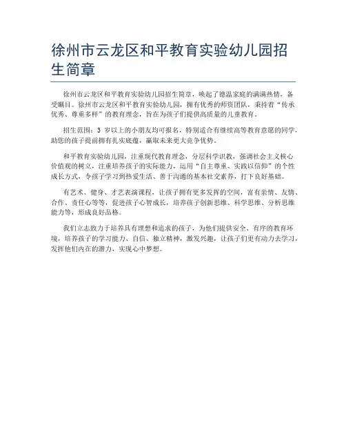 徐州经开区年华巷幼儿园招生简章徐州经开区年华巷幼儿园招生简章一、学校简介徐州经开区年华巷幼儿园是经开区管委会直属事业单位,位于徐州市经济技术开发区年华巷8号,占地面积3000平方米。