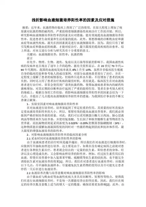 浅析影响血液细菌培养阳性率的因素及应对措施摘要:近年来,抗菌药物在临床上得到了广泛的使用,在很大程度上增加了病原菌对抗菌药物的耐药性,严重阻碍着细菌感染性疾病诊疗工作的开展,所以,研究影响血液细菌培养阳性率的因素及应对措施,能有效地提高血液细菌培养阳性率,促进患者生命质量和生活质量的提高。