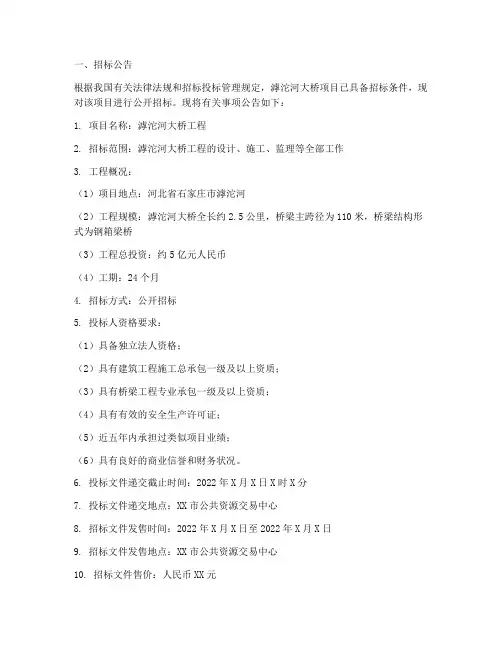 6. 投标文件递交截止时间:2022年X月X日X时X分7. 投标文件递交地点:XX市公共资源交易中心8. 招标文件发售时间:2022年X月X日至2022年X月X日9. 招标文件发售地点:XX市公共资源交易中心10. 招标文件售价:人民币XX元二、招标文件内容1. 项目概况(1)项目名称:滹沱河大桥工程(2)项目地点:河北省石家庄市滹沱河(3)工程规模:滹沱河大桥全长约2.5公里,桥梁主跨径为110米,桥梁结构形式为钢箱梁桥(4)工程总投资:约5亿元人民币(5)工期:24个月2. 投标人资格要求(1)具备独立法人资格;(2)具有建筑工程施工总承包一级及以上资质;(3)具有桥梁工程专业承包一级及以上资质;(4)具有有效的安全生产许可证;(5)近五年内承担过类似项目业绩;(6)具有良好的商业信誉和财务状况。