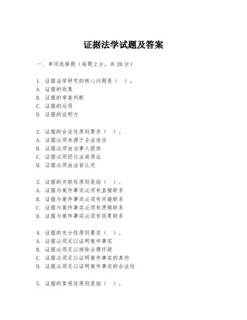 A. 证据的收集与保全B. 证据的审查判断C. 证据的运用与排除D. 证据的法律效力答案:B2. 证据的合法性要求不包括以下哪一项?()A. 证据来源合法B. 证据形式合法C. 证据内容合法D. 证据的非法获取答案:D3. 下列哪项不属于证据的可采性条件?()A. 证据的关联性B. 证据的充分性C. 证据的合法性D. 证据的客观性答案:B4. 证据的证明力大小通常取决于()。