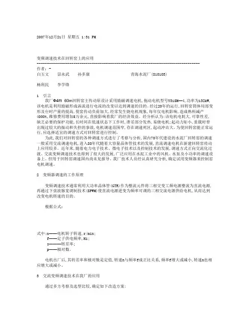 森兰变频器在水泥回转窑窑中主传动上的应用关键词:回转窑、变频调速、节能Key words:Rotary kiln Variable-frequency speed control Energy conservation摘要:水泥回转窑窑中主传动采用变频调速,变频器容量的选择既要考虑起动过程中的特点,又要兼顾正常运行,使投资不可过大,而且节能显著。