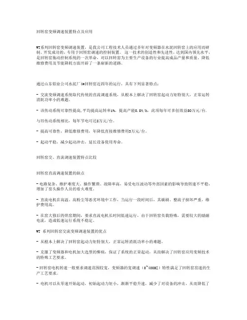 回转窑交、直流调速装置特点比较回转窑直流调速装置的缺点- 电路复杂、维护难度大、操作繁琐、故障率高,易受电压波动等外部因素的影响导致转速不平稳,增加了窑头操作人员的看火难度。