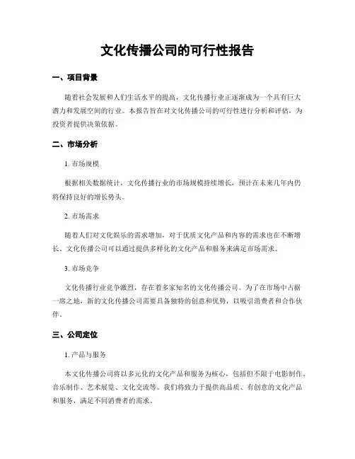 文化传播公司的可行性报告一、项目背景随着社会的发展和人们生活水平的提高,文化产业逐渐成为经济增长的重要支柱。