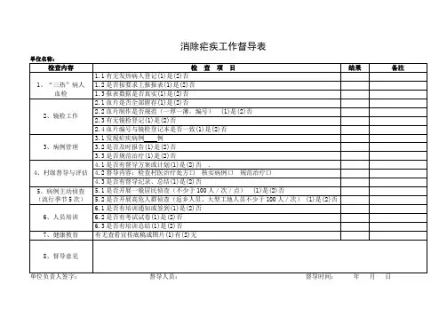 消除疟疾工作督导表(疾控机构)(1)肇庆市消除疟疾工作传染病督导表(疾控机构)督导单位:被督导单位:项目内容督导内容年度计是否存有201*、201*年的年度计划、方案、是口否口督导频次:划总结总结、督导通报、督导频次机构人员保障措施资料管理寄生虫病专门有科室或相关科室设置专(兼)防治疟疾职技术人员配置设立消除疟疾工作领组与消除疟疾相关文件是否整理归档201*、201*年疟疾防治季度报表、校对年度报表是否汇总整理底稿、填报时是否存在缺项201*、201*年全县(市、区)血检总人数是否达(0.5‰)是口否口1名口2名口3名口是口否口有口否,未整理归档口报表是否汇总是口否口上报是否及时是口否口是否整理存档是口否口201*年血检人数:201*年血检人数:发热病人血检201*、201*同年对所辖单位的复核血片(5%)、201*翌年末复核血片数:201*年有否有反馈反馈201*翌年末复核血片数:201*年是否有反馈是否对医院确诊病例复核确诊疟疾24小时内报告两万五千病媒六小时处置(①两周内的发热病人调查②采血③灭蚊措施)进行病例调查发热病人血清学监测(14天内送省)是否有完整的疫情处置原始报告201*、201*年培训计划、教材、通知、培训科熊、总结等资料201*、201*年县级临床医生专业技能情况是口,例否口①诊断后24小时报告数:②报告病例数:③报告率:①发热病人调查人数:②需采血人数:③室内灭虫平方数:室外防蚊平方数:①案调查病例数:②报告病例数:③个案调查率:有口无口是口否口齐全口不齐全口应培训人数:201*、201*年创纪录培训人数:应培训人数:201*、201*年创纪录培训人数:应培训人数:201*、201*年创纪录培训人数:疫点处置消除措施培训课程201*、201*年底县级检验情况人员培训情况201*、201*年医生卫生临床医生培训情况201*、201*年卫生院镜检咨询服务人员培训情况培训201*、201*年卫生院院防疫人员培训情况应人数:201*、201*年累计职业培训人数:应培训人数:201*、201*年累计职业培训人数:201*、201*年健康高等教育计划、总结、材料、齐全口不齐全口照片等资料广播、电视宣传消除措施健康教育报刊宣传黑板报、宣传栏、画发放宣传单张横额居民疟疾防治知识知晓率调查中小学生疟疾防治知识知晓率调查有口无口播放次有口无口期数次板报、宣传栏期数:发放宣传单张数量:制作横幅数:①调查人数:②知晓人数:③知晓率:①调查人数:②知晓人数:③知晓率:督导组人员签名:年月日陪同人签名:年月日扩展阅读:关于开展201*通知年底消除疟疾工作督导的通知(1)关于开展201*消除疟疾工作的综合督导的通知各县区(管理区)卫生局、市疾病公共安全控制中心:根据《湖南省201*-201*年消除疟疾行动计划》的要求,为进一步了解我市消除结核病疟疾工作进展情况,查找消除疟疾工作中存在的存在问题,推动我市消除疟疾工作的顺利完成,经研究决定,我局拟于201*年10月组织有关人员对三类县进行督导。