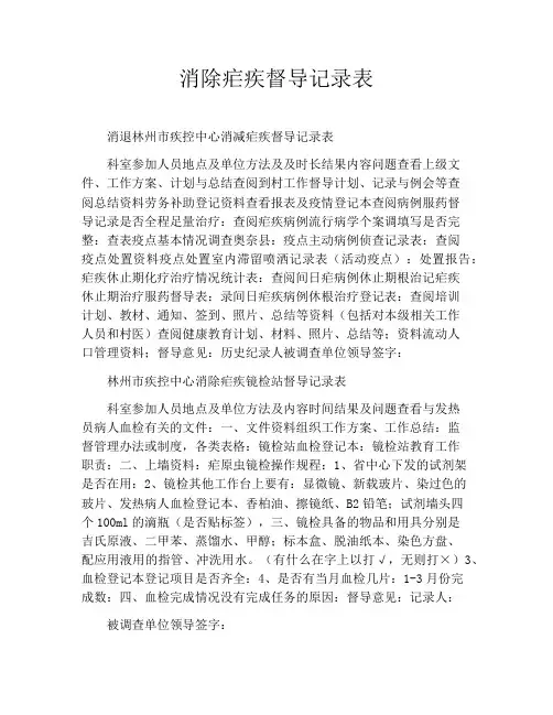 消除疟疾督导记录表消退林州市疾控中心消减疟疾督导记录表科室参加人员地点及单位方法及及时长结果内容问题查看上级文件、工作方案、计划与总结查阅到村工作督导计划、记录与例会等查阅总结资料劳务补助登记资料查看报表及疫情登记本查阅病例服药督导记录是否全程足量治疗:查阅疟疾病例流行病学个案调填写是否完整:查表疫点基本情况调查奥奈县:疫点主动病例侦查记录表:查阅疫点处置资料疫点处置室内滞留喷洒记录表(活动疫点):处置报告:疟疾休止期化疗治疗情况统计表:查阅间日疟病例休止期根治记疟疾休止期治疗服药督导表:录间日疟疾病例休根治疗登记表:查阅培训计划、教材、通知、签到、照片、总结等资料(包括对本级相关工作人员和村医)查阅健康教育计划、材料、照片、总结等;资料流动人口管理资料;督导意见:历史纪录人被调查单位领导签字:林州市疾控中心消除疟疾镜检站督导记录表科室参加人员地点及单位方法及内容时间结果及问题查看与发热员病人血检有关的文件:一、文件资料组织工作方案、工作总结:监督管理办法或制度,各类表格:镜检站血检登记本:镜检站教育工作职责:二、上墙资料:疟原虫镜检操作规程:1、省中心下发的试剂架是否在用:2、镜检其他工作台上要有:显微镜、新载玻片、染过色的玻片、发热病人血检登记本、香柏油、擦镜纸、B2铅笔;试剂墙头四个100ml的滴瓶(是否贴标签),三、镜检具备的物品和用具分别是吉氏原液、二甲苯、蒸馏水、甲醇;标本盒、脱油纸本、染色方盘、配应用液用的指管、冲洗用水。