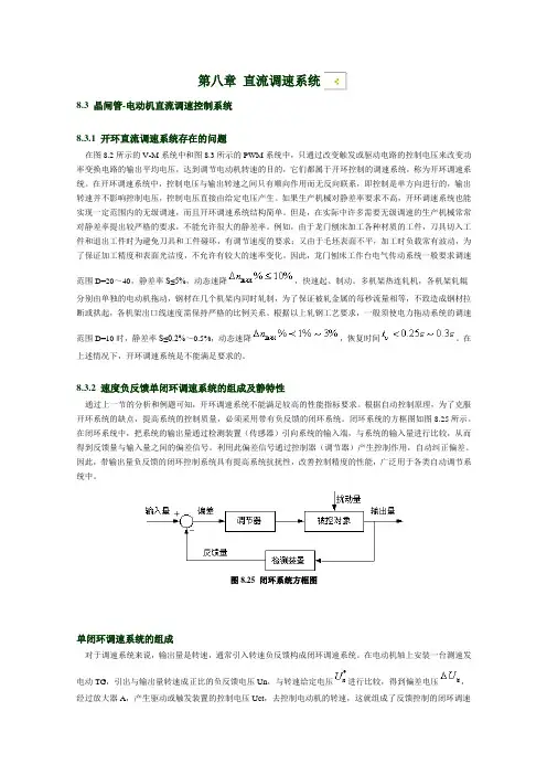 第八章直流调速系统8.1 概述调速方法通常有机械的、电气的、液压的、气动的几种,仅就机械与电气调速方法而言,也可采用电气与机械配合的方法化机械变速机构,提高传动效率,操作简单,易于获得无极调速,便于实现远距离控制和自动控制,因此,在生产机械中广泛采由于直流电动机具有极好的运动性能和控制特性,尽管它不如交流电动机那样结构简单、价格便宜、制造方便、维护容易,但是近年来,随着计算机技术、电力电子技术和控制技术的发展,交流调速系统发展很快,在许多场合正逐渐取代直流调速系统。