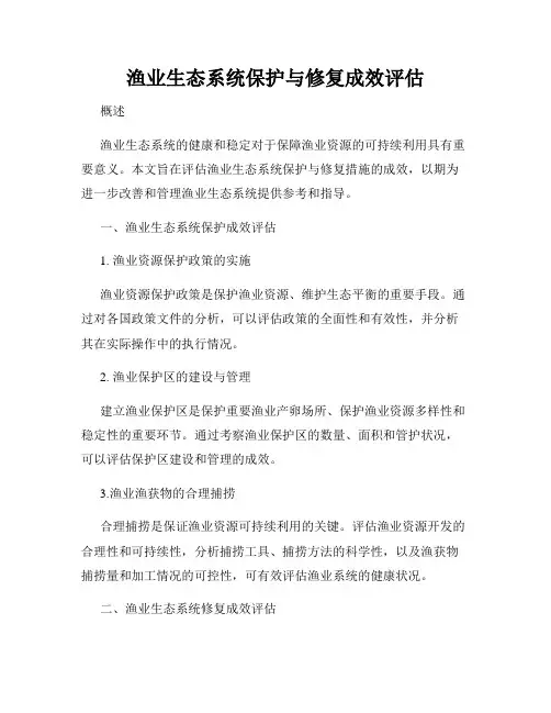 一、渔业生态系统保护成效评估1. 渔业资源保护政策的实施渔业资源保护政策是保护渔业资源、维护生态平衡的重要手段。