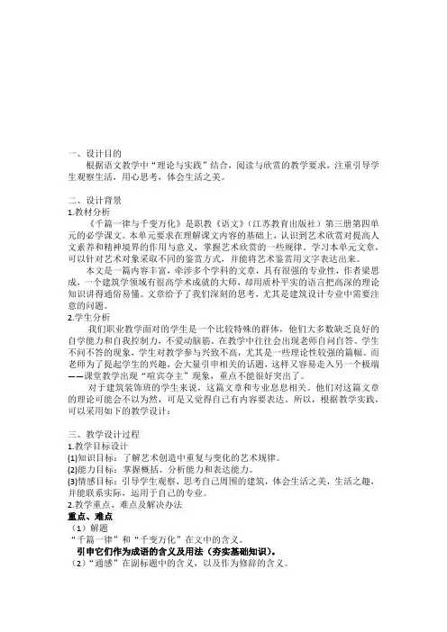 二、设计背景1.教材分析《千篇一律与千变万化》是职教《语文》(江苏教育出版社)第三册第四单元的必学课文。