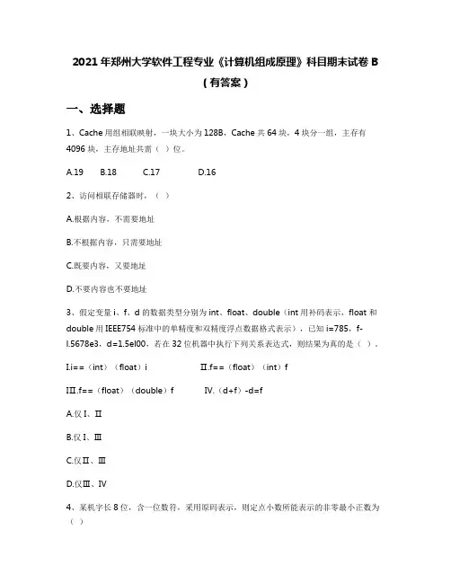 2021年郑州大学软件工程专业《计算机组成原理》科目期末试卷B(有答案)一、选择题1、Cache用组相联映射,一块大小为128B,Cache共64块,4块分一组,主存有4096块,主存地址共需()位。