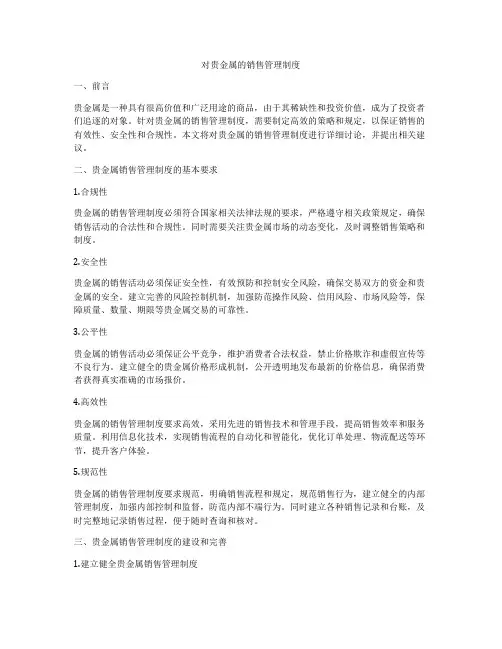 二、贵金属销售管理制度的基本要求1.合规性贵金属的销售管理制度必须符合国家相关法律法规的要求,严格遵守相关政策规定,确保销售活动的合法性和合规性。