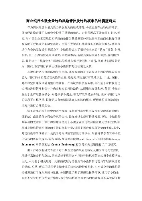 商业银行小微企业违约风险管控及违约概率估计模型研究作为国民经济中最具活力和创新力的组成部分,小微企业在拉动经济增长、保持经济稳定并扩大就业中扮演了重要的角色。