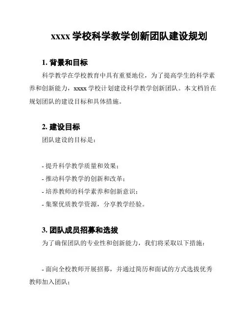 XXXX学院教学科研创新团队建设方案为全面落实学校人才强校战略,加快创新人才与拔尖人才培养,保证XXX学院教学、科研持续健康发展,营造学术氛围,增强凝聚力,结合学院实际情况,决定成立XX学院教学科研创新团队,特制订本方案。