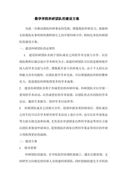 数学学院科研团队的建设方案为进一步推动我院科研事业的发展,增强我院科研实力,鼓励和支持我院从事科研的教师相互之间开展科研合作,特制定本院科研团队的建设方案。