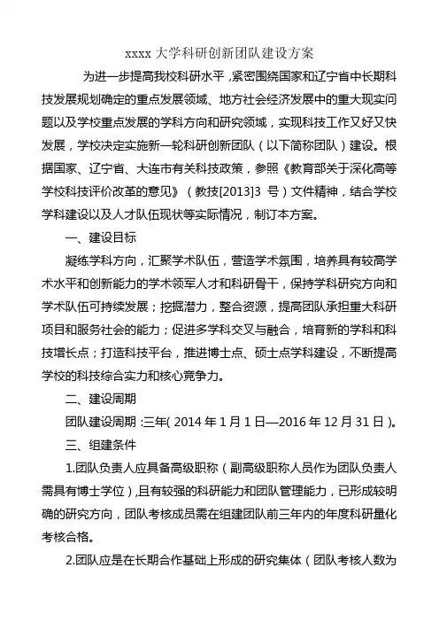xxxx大学科研创新团队建设方案为进一步提高我校科研水平,紧密围绕国家和辽宁省中长期科技发展规划确定的重点发展领域、地方社会经济发展中的重大现实问题以及学校重点发展的学科方向和研究领域,实现科技工作又好又快发展,学校决定实施新一轮科研创新团队(以下简称团队)建设。