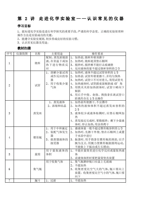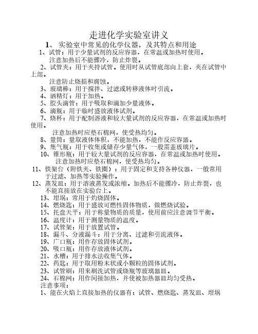 走进化学实验室讲义1、实验室中常见的化学仪器,及其特点和用途1、试管:用于少量试剂的反应容器,在常温或加热时使用。