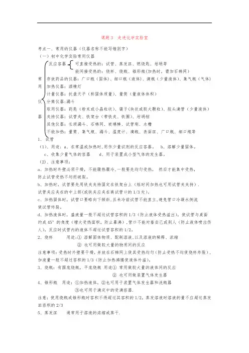 课题3 走进化学实验室考点一、常用的仪器(仪器名称不能写错别字)(一)初中化学实验常用仪器反应容器可直接受热的:试管、蒸发皿、燃烧匙、坩埚等能间接受热的:烧杯、烧瓶、锥形瓶(加热时,需加石棉网)常存放药品的仪器:广口瓶(固体)、细口瓶(液体)、滴瓶(少量液体)、集气瓶(气体) 用加热仪器:酒精灯计量仪器:托盘天平(称固体质量)、量筒(量液体体积)仪分离仪器:漏斗取用仪器:药匙(粉末或小晶粒状)、镊子(块状或较大颗粒)、胶头滴管(少量液体)器夹持仪器:试管夹、铁架台(带铁夹、铁圈)、坩埚钳其他仪器:长颈漏斗、石棉网、玻璃棒、试管刷、水槽不能加热:量筒、集气瓶、漏斗、温度计、滴瓶、表面皿、广口瓶、细口瓶等1、试管(1)、用途: a、在常温或加热时,用作少量试剂的反应容器。