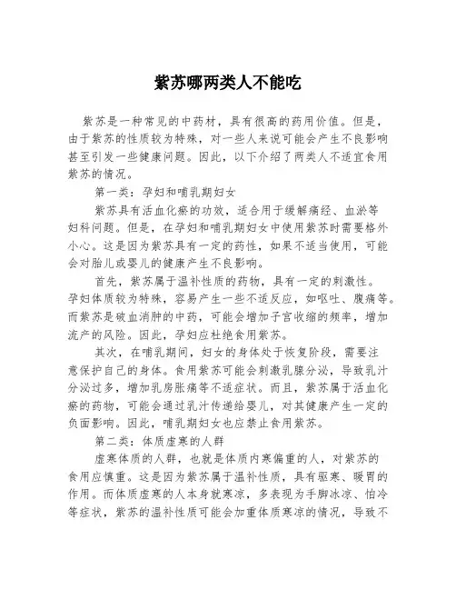第一类:孕妇和哺乳期妇女紫苏具有活血化瘀的功效,适合用于缓解痛经、血淤等妇科问题。