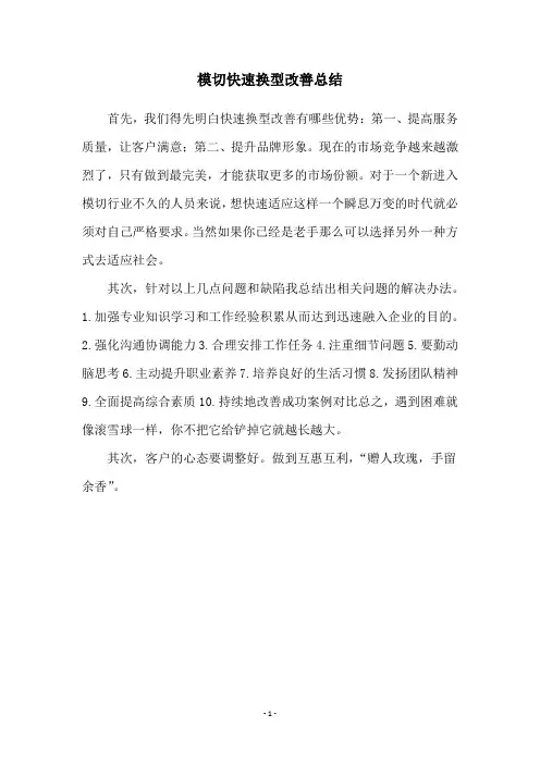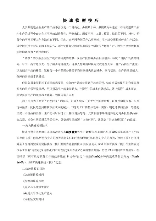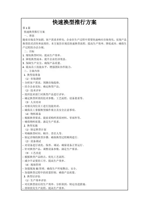快速换型的实施方法1. 制定详细的换型计划在进行快速换型前,需要制定详细的换型计划,包括以下内容: - 确定换型时间:根据产品特点和生产线配置,确定换型所需时间,并在计划中安排充足的换型时间。