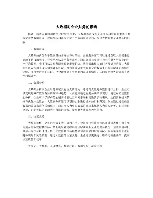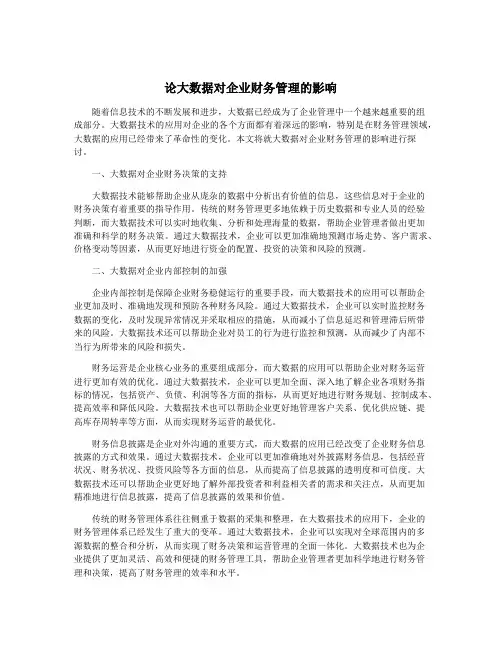 一、大数据对财务管理的影响1. 更加精准的财务决策大数据技术可以通过对海量数据的分析和挖掘,为企业提供更加精准的财务决策支持。