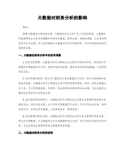 一、大数据对财务分析的影响1. 数据规模的增大:大数据时代,企业可以获得海量的数据,包括财务报表、销售数据、用户行为数据等。