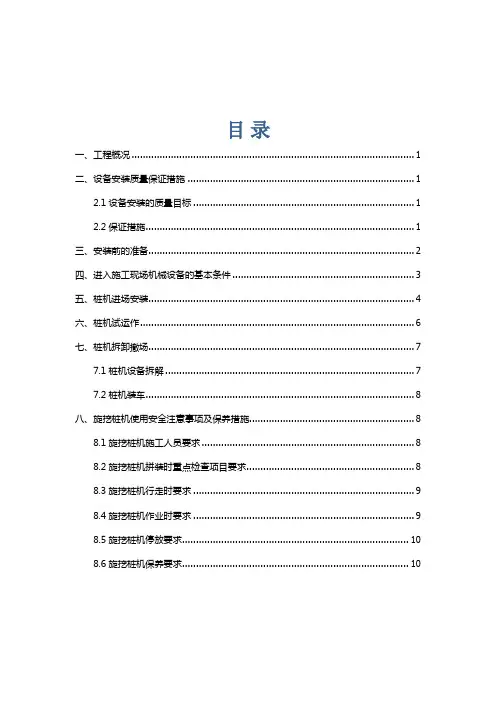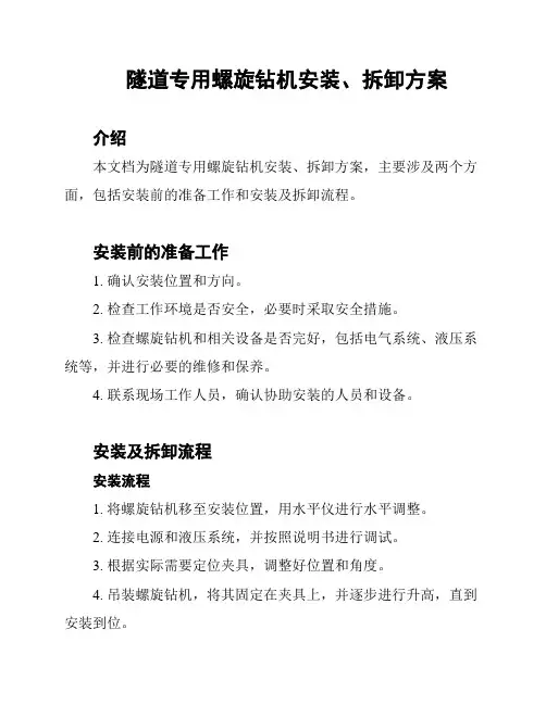 本文档为隧道专用螺旋钻机安装、拆卸方案,主要涉及两个方面,包括安装前的准备工作和安装及拆卸流程。