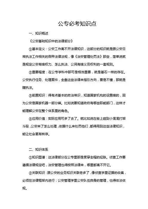 公专必考知识点一、知识概述《公安基础知识中的法律部分》①基本定义:公安工作离不开法律知识,这部分的知识就是跟公安日常执法工作相关的各种法律法规,像《治安管理处罚法》那些,简单说就是规定公安有啥权力、怎么执法、公民有啥义务权利的一套规则。