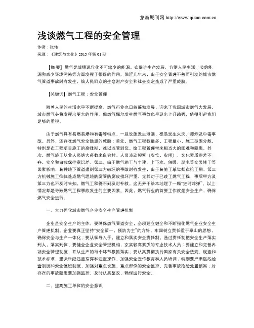 浅谈燃气工程的安全管理作者:张伟来源:《建筑与文化》2013年第01期【摘要】燃气是城镇现代化不可缺少的能源,在促进生产发展、方便人民生活、节约能源和减少环境污染等方面发挥了很好的作用。